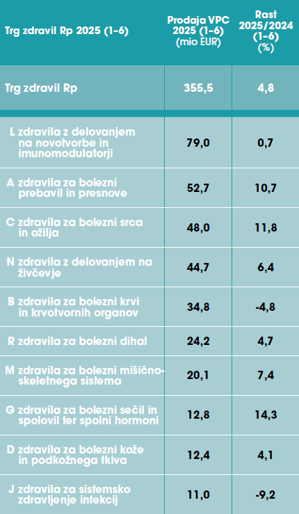 V prvi polovici leta 2025 je trg zdravil na recept v kanalu lekarn znašal 355,5 milijona evrov in je glede na lani zrasel za 4,8 %.