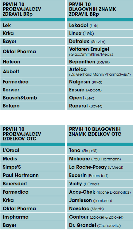 Predstavljamo deset največjih proizvajalcev ter blagovnih znamk zdravil brez recepta in ostalih izdelkov OTC na slovenskem farmacevtskem trgu v kanalu lekarn (glede na vrednost prodaje, VPC):