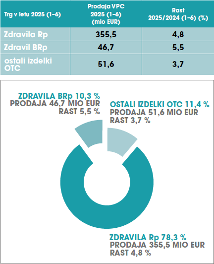 V prvi polovici leta 2025 (od januarja do junija) je celoten trg zdravil in ostalih OTC izdelkov v Sloveniji znašal 619,2 milijona evrov (5,0 % rast). Trg zdravil in ostalih OTC izdelkov v kanalu bolnic je znašal 144,2 milijona evrov (3,6 % rast), v kanalu lekarn pa 453,8 milijonov evrov (4,8 % rast).