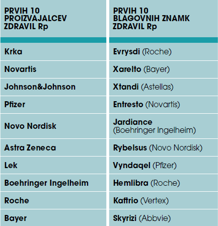 Predstavljamo deset največjih proizvajalcev in blagovnih znamk zdravil na recept na slovenskem farmacevtskem trgu v kanalu lekarn (glede na vrednost prodaje, VPC):