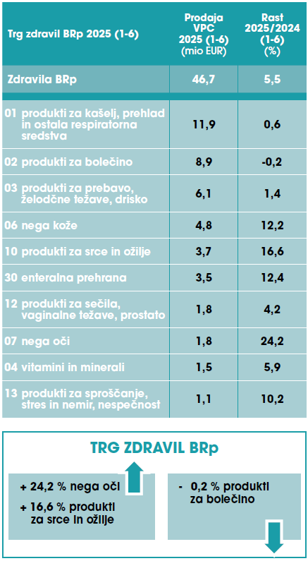 Trg zdravil brez recepta (BRp) in ostalih izdelkov OTC je v prvi polovici letošnjega leta skupno znašal 98,3 milijonov evrov. V primerjavi z lanskim letom je zrasel za 4,5 %.